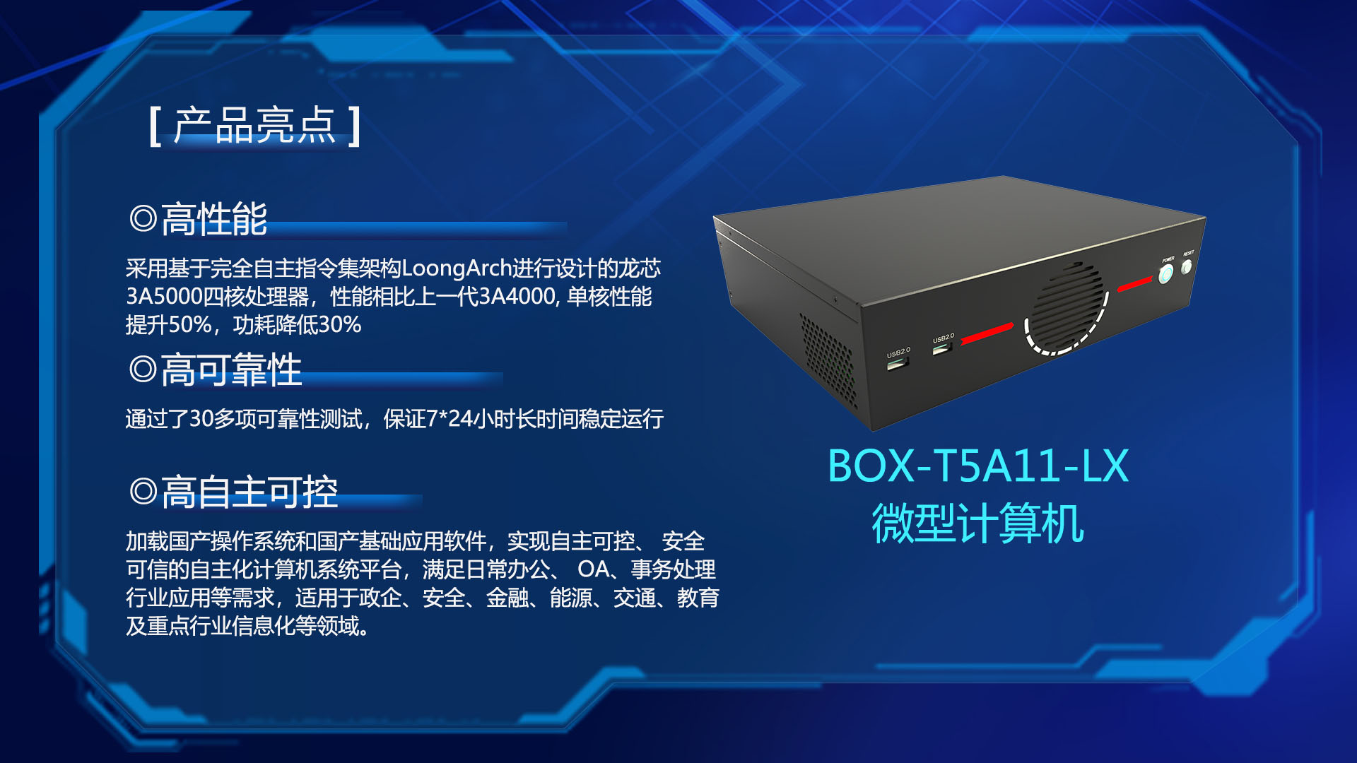 研恒(特控)BOX-T5A11-LX微型計算機采用基于完全自主指令集架構LoongArch進行設計的龍芯3A5000四核處理器,性能相比上一代3A4000, 單核性能提升50%,功耗降低30%,指令集系統架構承載的軟件生態走向完全自主。整機采用純工業設計,通過了30多項可靠性測試,保證設備7*24小時長時間穩定運行。配套國產BIOS,加載國產操作系統和國產基礎應用軟件,實現自主可控、 安全可信的自主化計算機系統平臺,滿足日常辦公、 OA、事務處理,行業應用等需求,適用于政企、安全、金融、能源、交通、教育及重點行業信息化等領域。