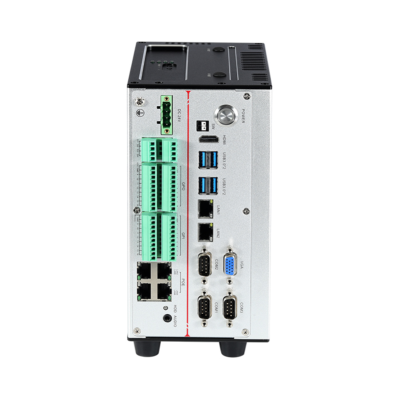 外觀時尚 : 鋁合金一體成型,結構緊湊小巧,工藝精細,科技時尚高性能 : 支持65W及以下6/7/8/9 代1151 Intel Core i7/i5/i3 系列處理器穩(wěn)定可靠 : 純工業(yè)設計,強勁解熱熱管與純銅一體化的優(yōu)良散熱結構,全密封鋁合金箱體,大面積鋁鰭散熱,可實現(xiàn)橫向與豎向等多種放置的對流散熱,機箱可抗接觸式6KV強電磁干擾接口豐富 6*LAN,3*COM,4*USB3.0,1*2.5寸硬盤位,1*遠程開關,1*VGA,1*HDMI,4*PWM 光源控制,32*GPIO(16*GPI+16*GPO),1*音頻Line-Out+MIC二合一,1*MSATA,1*MPCIE(USB2.0+PCIE信號),1*MPCIE(USB2.0 信號),1*M.2(KEY-E,2230,USB2.0+PCIE信號,支持WIFI+BT)